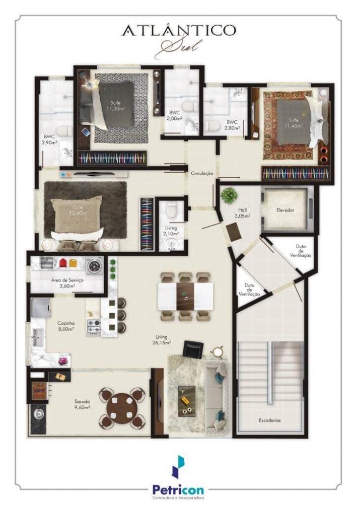 Apartamentos de 03 suítes + lavabo, 02 vagas de garagens, com 111,30 m² de área privativa e 194,48 m² de total;